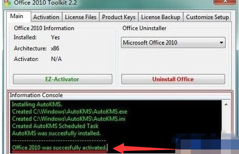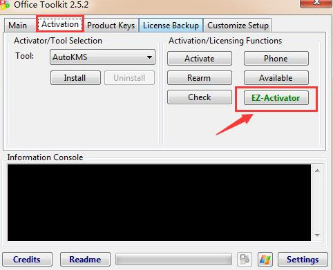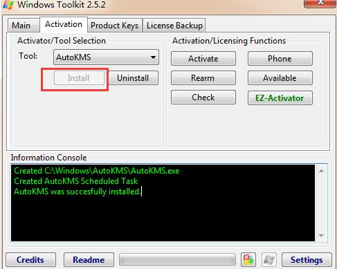 4、鼠標選擇“Activation”選項,先點左邊的“install”,安裝AutoKMS。顯示succesfully installed后點擊右邊下面的“EZ-Activator”按鈕即可。