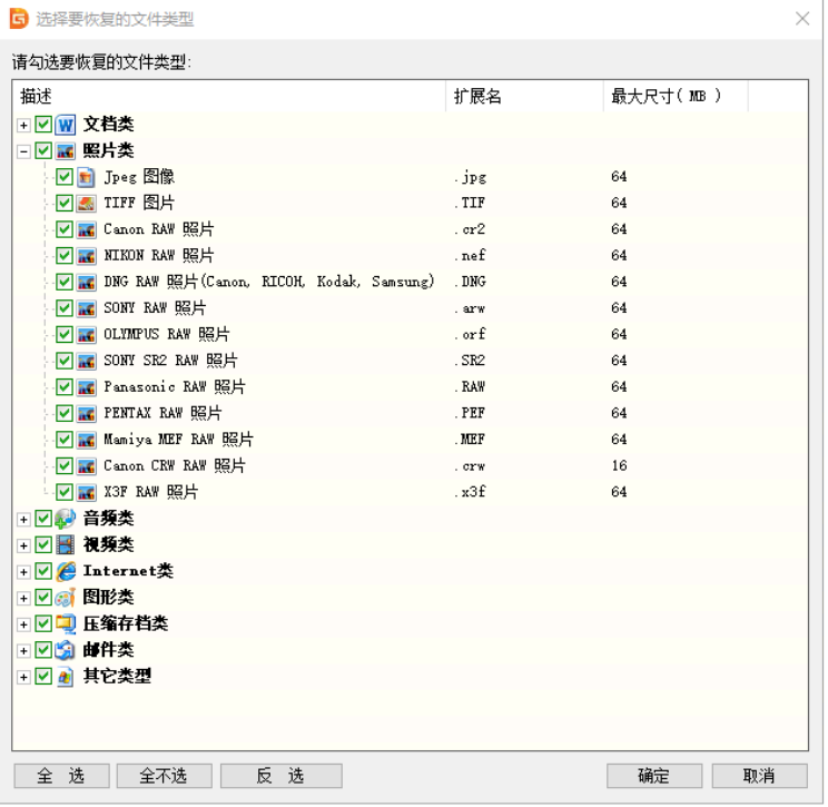 3、在掃描的文件類型上面,勾選要恢復的文件類型,勾選好之后,點擊確定。