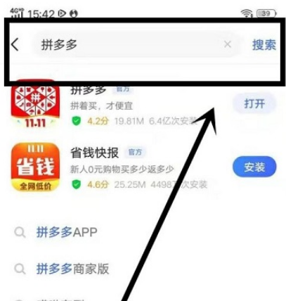 3.接著我們在搜索欄里輸入拼多多,然后點擊安裝就可以了,這里我們手機已經下載了,所以是打開,大家根據自己的情況來。