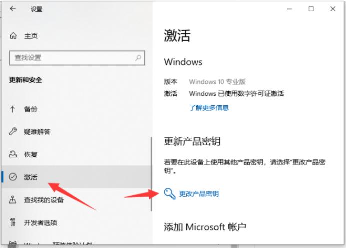 3、選中左側的激活,再點擊右側的更改產品密鑰。