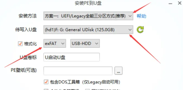 2.安裝方法點擊推薦的三分區方式。待寫入U盤就是剛剛插入的U盤。這里格式選擇【exFAT】即可。
