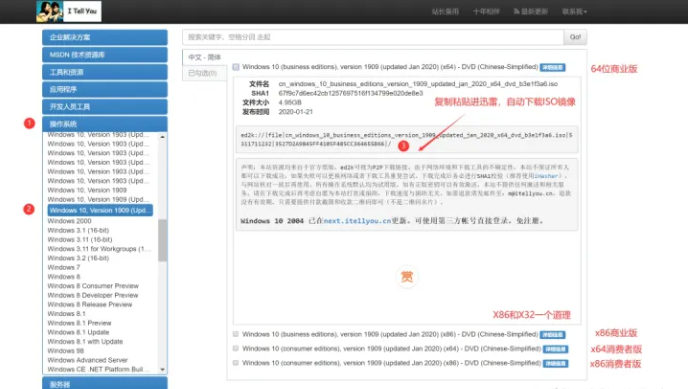1、進入MSDN網站后,點擊【操作系統】選擇要安裝的系統鏡像,將【ed2k】下載碼復制粘貼進迅雷下載。