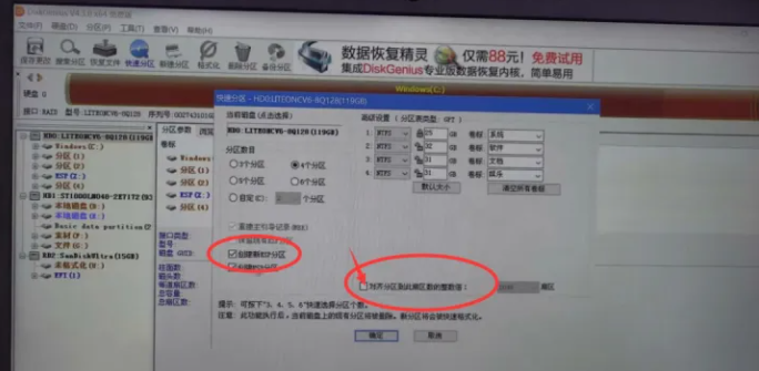 9、記得一定要對齊4k扇區或者2048(一般默認這兩個選項)。PS:切記一定要勾選對齊扇區,不然會導致硬盤損壞,降低使用壽命,嚴重可能會導致數據丟失。