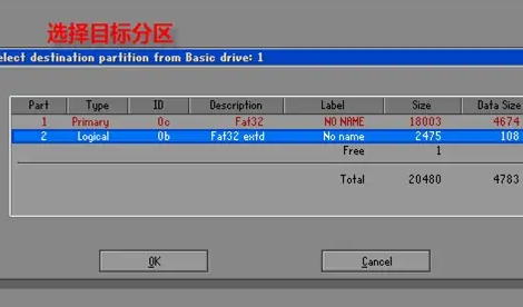 5、隨后,完成上述步驟后,選擇目標分區。紅色分區表示備份鏡像文件所在的分區,因此不是可選的。 選擇需要安裝(覆蓋)的分區,然后單擊“OK”按鈕開始安裝。