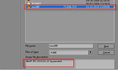 2、其次,完成上述步驟后,按下鍵盤上的“Tab”鍵以移動光標并找到鏡像文件。選中后,創建備份時寫入的文本信息將顯示在下面的描述欄中,然后點擊“OPEN”按鈕,如下圖所示,然后進入下一步。