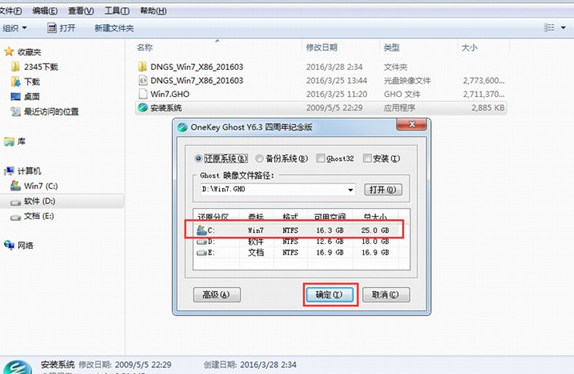 5、鼠標雙擊"安裝系統.EXE",選擇"C盤"(C盤為默認系統磁盤),插入映像文件Win7.GHO,單擊執行即可。