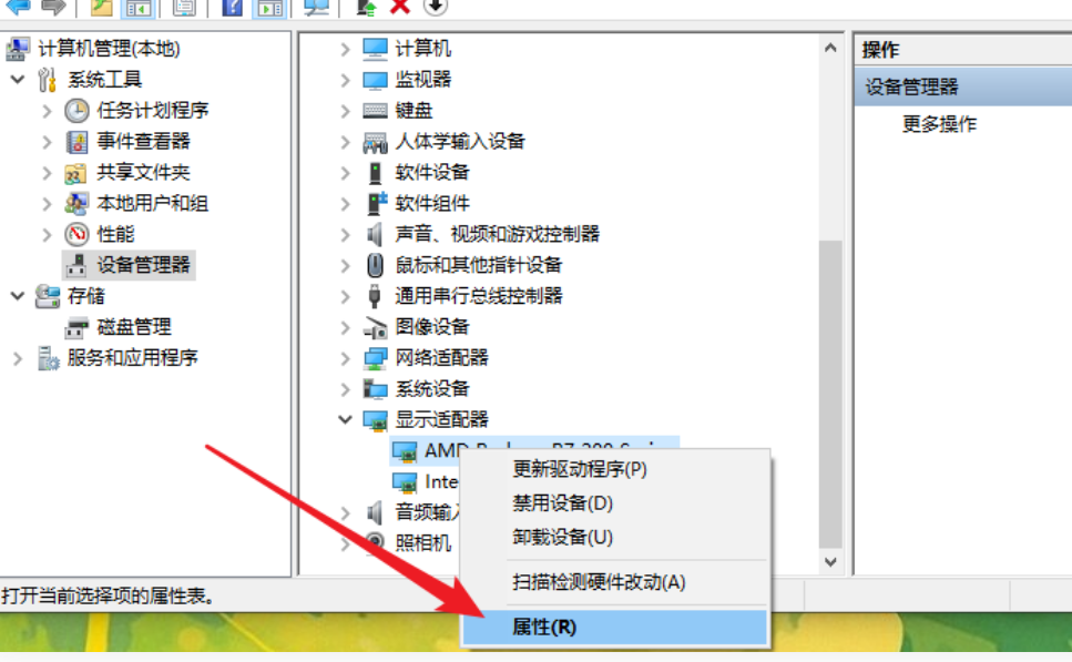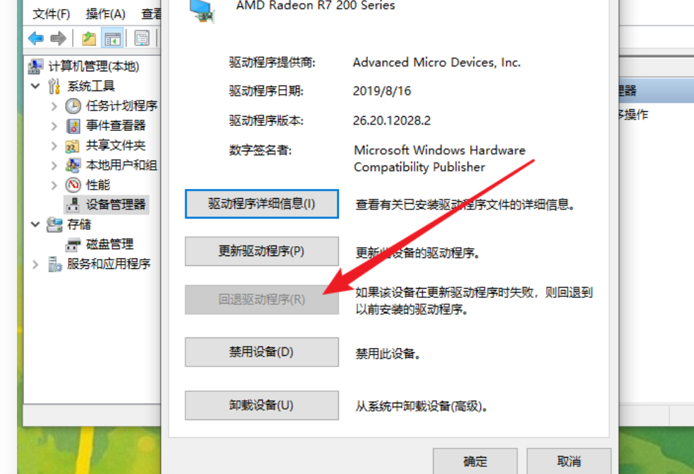 在win10系統中,右鍵“此電腦”,選擇“管理”進入;在計算機管理界面,在左側欄點擊“設備管理”,在對應的右界面找到“顯示適配器”;右鍵單擊其中一個顯示黃色感嘆號的顯卡程序,然后點擊打開“屬性”;切換到“驅動程序”,可以看到下面有一個“退回驅動程序的選項”,點擊它進入。