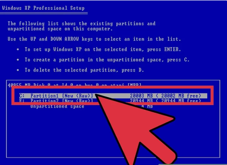 5、選擇要安裝的分區。您將看到已安裝硬盤驅動器上的可用分區列表。如果您在新硬盤上安裝 Windows XP,您應該只會看到一個標有“未分區空間”的條目。如果您的計算機上安裝了以前版本的 Windows 或 Linux,您可能會有多個分區。