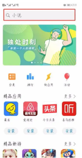 2、進入應用市場首頁界面,在首頁頂欄有一個放大鏡圖標的搜索框,點擊這個搜索框。