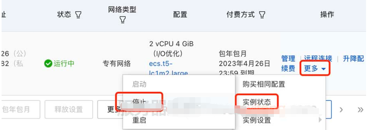 如上圖所示,可以看到“更換操作系統”選項是灰色的,不可以點擊的,這是因為更換操作系統的操作必須是在云服務器停止的狀態下才可以操作的,所以想要更換阿里云服務器操作系統,先停止云服務器實例。先停止實例,再更換操作系統。