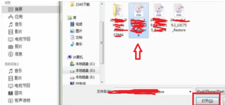 9、iTunes會彈出選擇文件對話窗,選擇下載好的ISO固件,點擊“打開”。