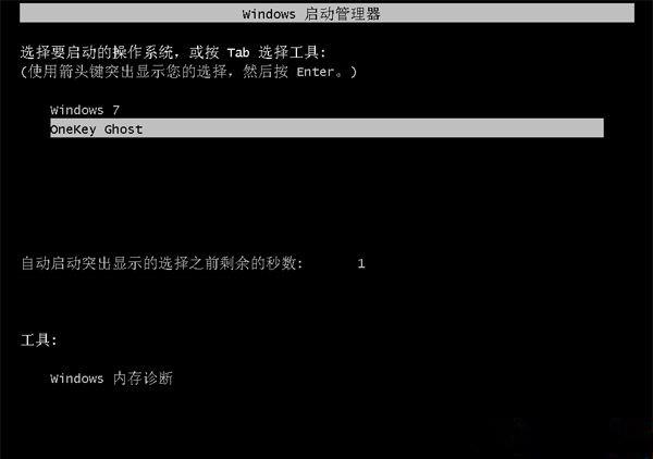 5、重啟電腦,開機啟動項多出Onekey Ghost,默認自動選擇Onekey Ghost進入安裝過程;