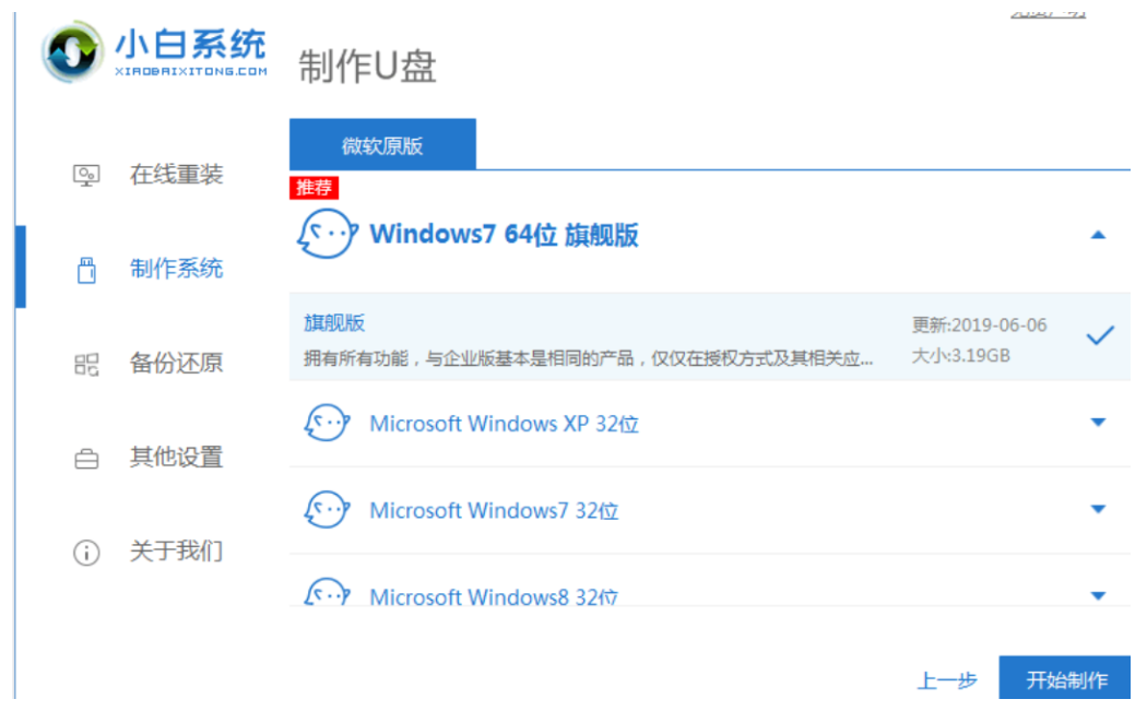 2、進入系統選擇界面選擇需要安裝的系統,點擊“開始制作”。