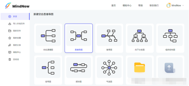 首先在瀏覽器中打開MindNow思維導圖的新建頁面,在右邊“新建空白思維導圖”中選擇合適的導圖結構,比如“思維導圖”。