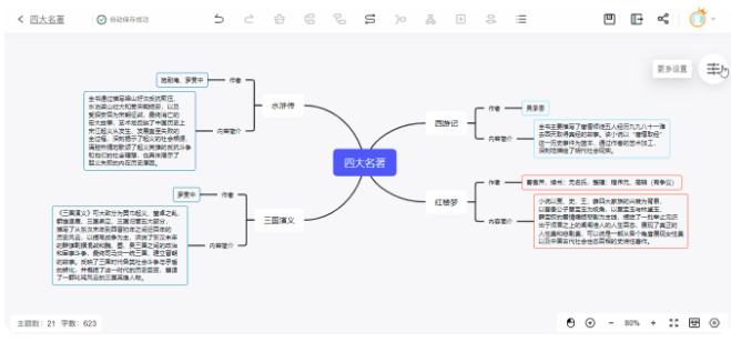 接著我們再根據二級主題發散思維添加分支,編輯更加完善的內容,比如根據二級主題“西游記”,可以再分析作者、內容簡介等等,鼠標點擊頂部工具欄中的“子主題”,點擊主題編輯內容,直至思維導圖內容編輯完成。