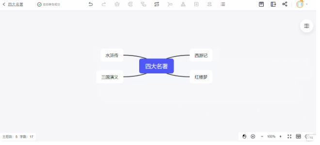 進入思維導圖創作頁面之后,圍繞需要的中心主題梳理思路,并用鼠標雙擊主題編輯我們需要的內容,比如需要編輯四大名著的思維導圖,鼠標雙擊中心主題編輯“四大名著”,再鼠標雙擊子主題編輯具體的名著。
