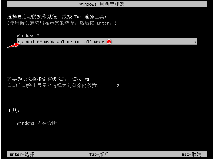 4、重啟電腦,選擇第二個“XiaoBai PE-MSDN Online Install Mode”.進入系統。