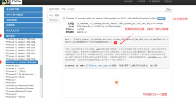 3.然后我們打開這個網站https://msdn.itellyou.cn/,進入網站后,點擊【操作系統】選擇你要安裝的系統鏡像,將【ed2k】下載碼復制粘貼進迅雷進行下載。