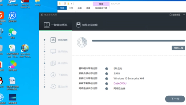 5.重啟電腦,此時就能啟動電腦了,找到桌面上面的重裝系統圖標,進入程序后,點擊重裝系統,它會自動進入系統重裝狀態,只要你網絡連接穩定正常,它會自動給電腦匹配合適的系統文件,用戶此時要做出勾選選擇,確定后就自動傻瓜式的進行重新安裝了。