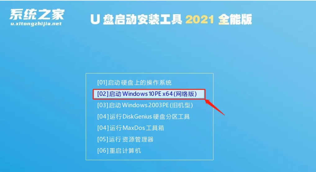2、U盤插入電腦,重啟電腦按快捷鍵選擇U盤為第一啟動項。進入后,鍵盤↑↓鍵選擇第二個【02】啟動Windows10PEx64(網絡版),然后回車。