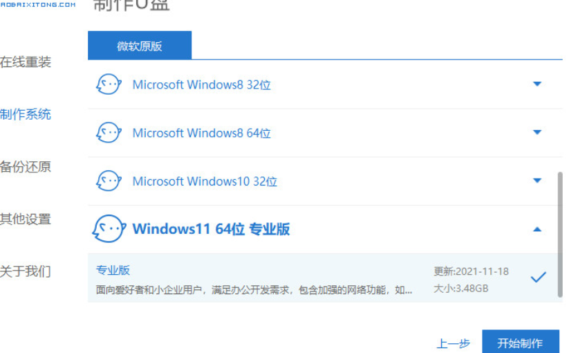 2、選擇自己需要的系統后點擊開始制作,這里我們選擇win11。