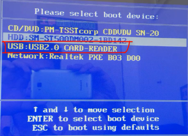 4、u盤插入需要重裝的電腦,并重啟電腦快速斷續的按啟動熱鍵進入快速啟動界面,選擇帶USB開頭的u盤啟動項回車鍵進入。