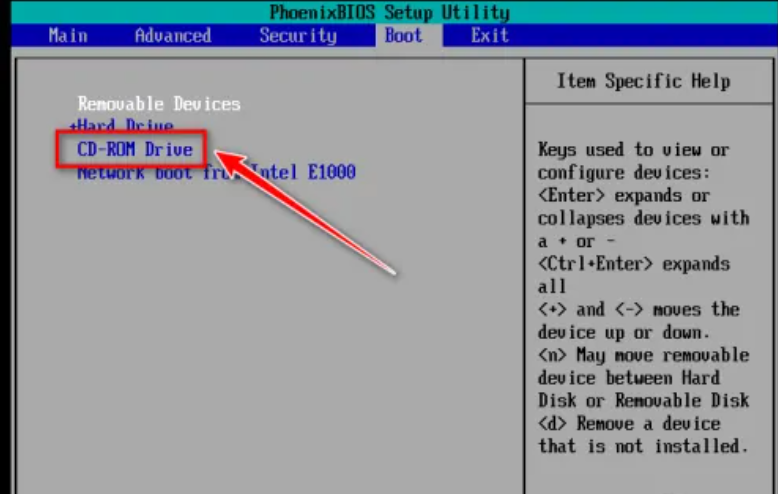 按數字小鍵盤上的+鍵將CD-ROM Drive移到第一行。