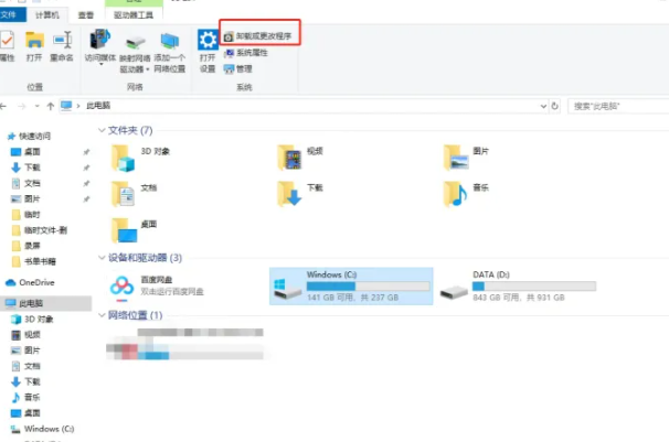 1.首先打開此電腦,單擊一下C盤,然后點擊上面的【卸載或更改程序】,打開后就可以移動磁盤文件了。