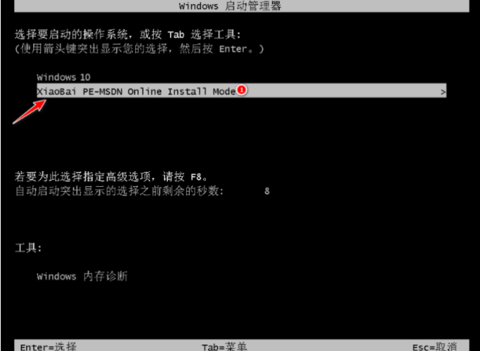 4、電腦重啟之后進入了開機選項頁面,選擇xiaobai-pe系統進入pe系統。