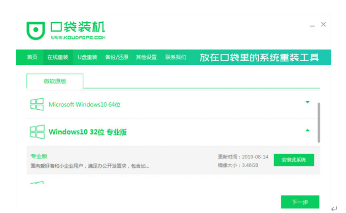 1、打開口袋裝機工具軟件,選擇系統版本以及應用軟件,點擊下一步;