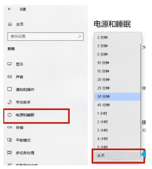 3、點擊“系統”進入,選擇左側的“電源和睡眠”,再找到“屏幕”和“睡眠”,將其全部設置為“從不”便可以修復。