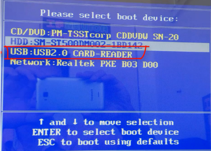 4、u盤插入我們需要重裝的電腦,重啟電腦快速斷續的按啟動熱鍵進入快速啟動頁面,選擇帶USB開頭的u盤啟動項回車鍵進入。