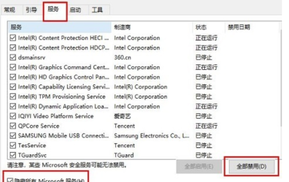 4、再點擊服務選項卡,勾線隱藏所有的服務,點擊全部禁用。