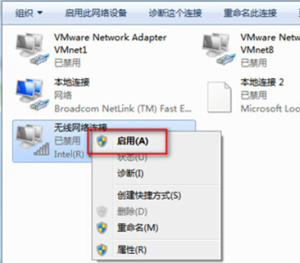步驟3、打開無線網絡的方法是,在圖標上右鍵鼠標,點擊啟用即可。