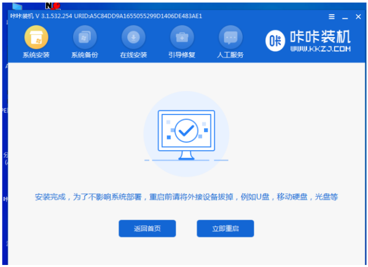 9、電腦進入pe系統之后,點擊打開咔咔軟件就會開始自動安裝系統。安裝完成之后,按照提示再次點擊立即重啟電腦。