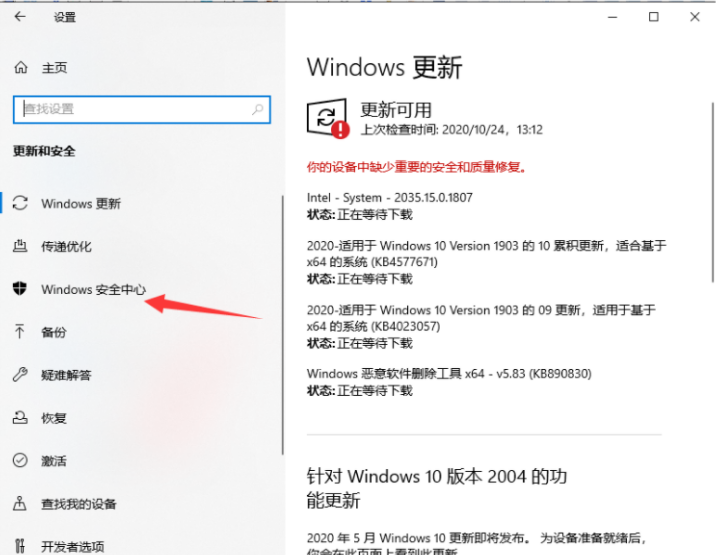 3、鼠標點擊Windows安全中心。