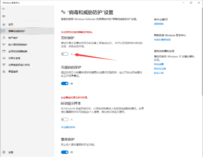 6、將實時保護,云提供的保護和篡改保護全部關閉。
