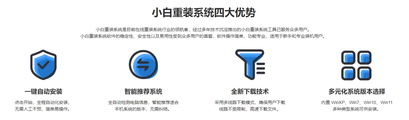 小白一鍵重裝系統工具是一款傻瓜式的電腦系統重裝軟件,可實現任何windows系統下一鍵重裝win7/xp/win8.1/win10/win11系統,是一款簡單、快速的系統重裝軟件。它擺脫了傳統借助光驅、軟件等介質的繁瑣,操作者無需任何技術基礎,隨時隨地實現傻瓜式電腦系統重裝!目前官方正式發布的最新版本為v12.6.49.2290