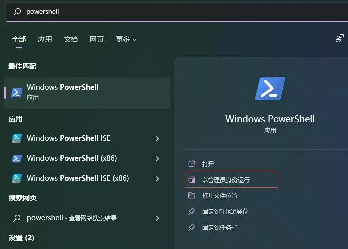 1.我們在Windows10/11家庭版下,搜索【Powershell】,在右側選擇【以管理員方式運行】,如果是Windows10/11專業版等,則可直接選擇【Windows Powershell(管理員)】方式運行。