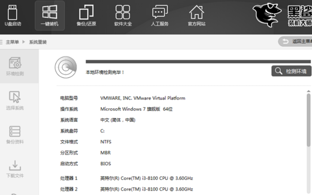 1、下載安裝后打開黑鯊裝機大師,點擊上方一鍵裝機,選擇系統重裝,軟件會進入環境檢測環節,檢測結束后點擊下一步。