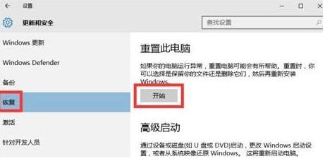 1.通過Win10“開始”菜單并依次打開“設置-更新與安全-恢復”選項,在右側菜單重置此電腦中選擇“開始”按鈕。
