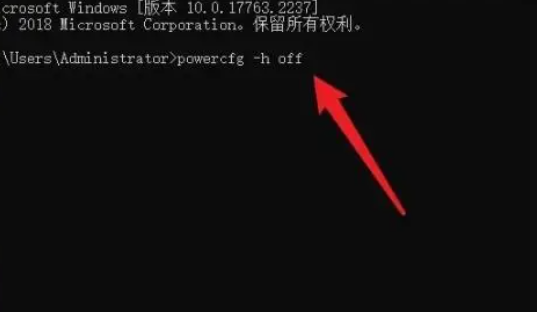 2、然后我們在窗口中輸入【powercfg -h off】,按下回車后即可關閉休眠功能,此前所生成的數十G的hiberfil.sys文件也會自行刪除。