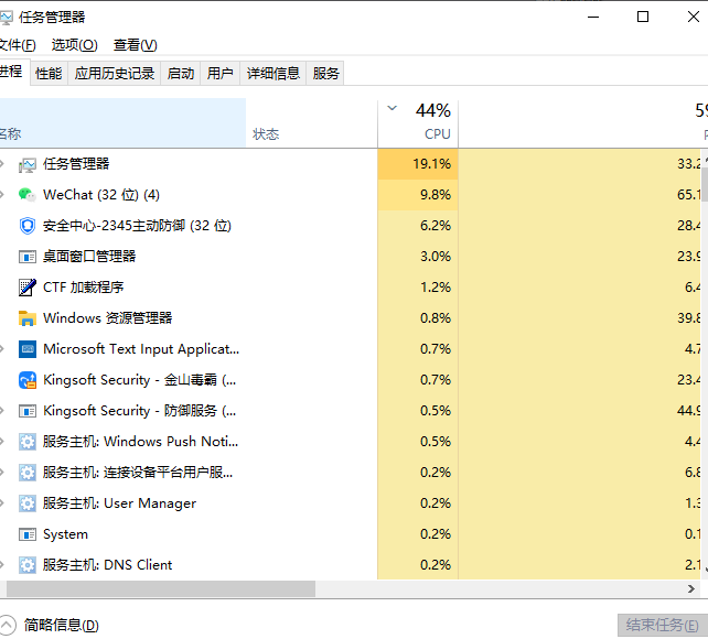 打開任務管理器:快捷鍵(Ctrl+shift+esc)查看任務管理器,然后關閉多余的程序