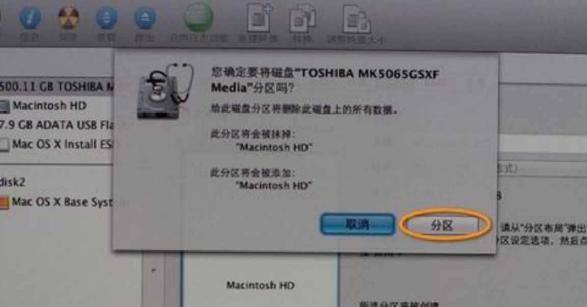 4、選擇要安裝系統的硬盤,點擊”分區“,格式選擇Mac OS擴展,點擊應用。