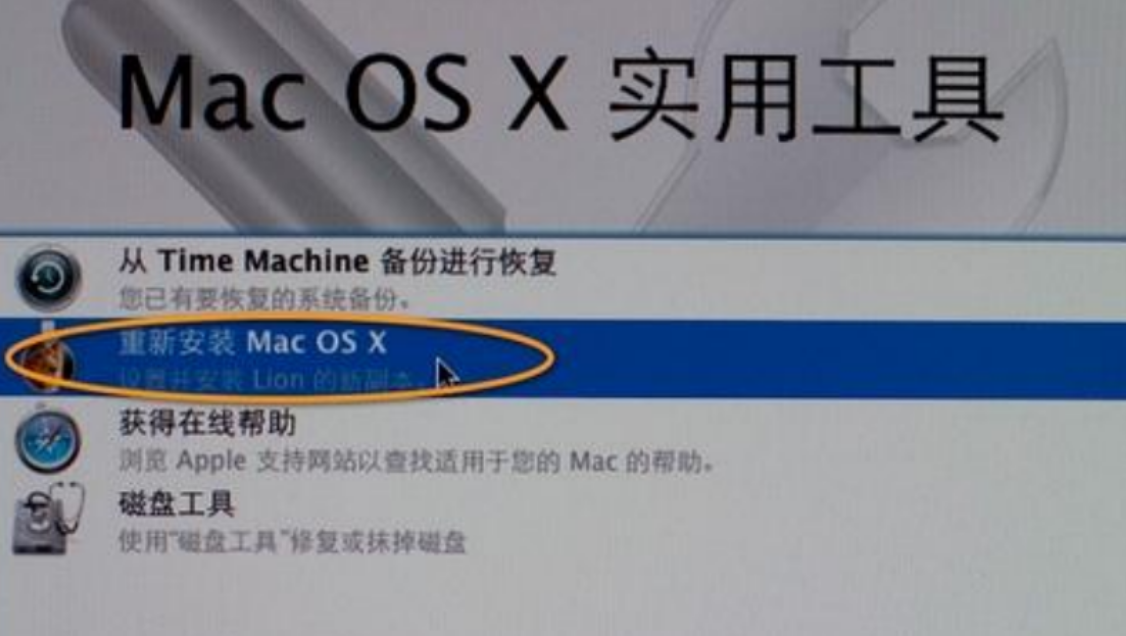 7.在實用工具,點擊”重新安裝Mac OS X“,繼續。