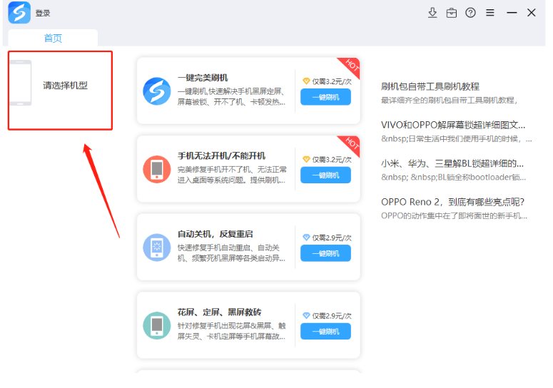 1、打開線刷寶軟件,然后點擊左上角“選擇機型”選擇手機對應的型號。