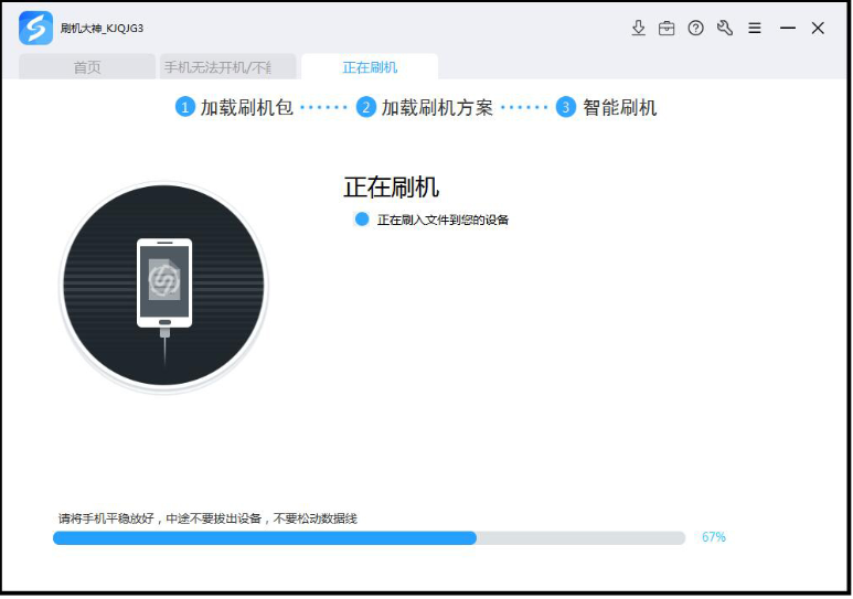 7、識別到端口后,工具會自動跳轉到“正在刷機”界面,期間請勿移動手機或插拔數據線。