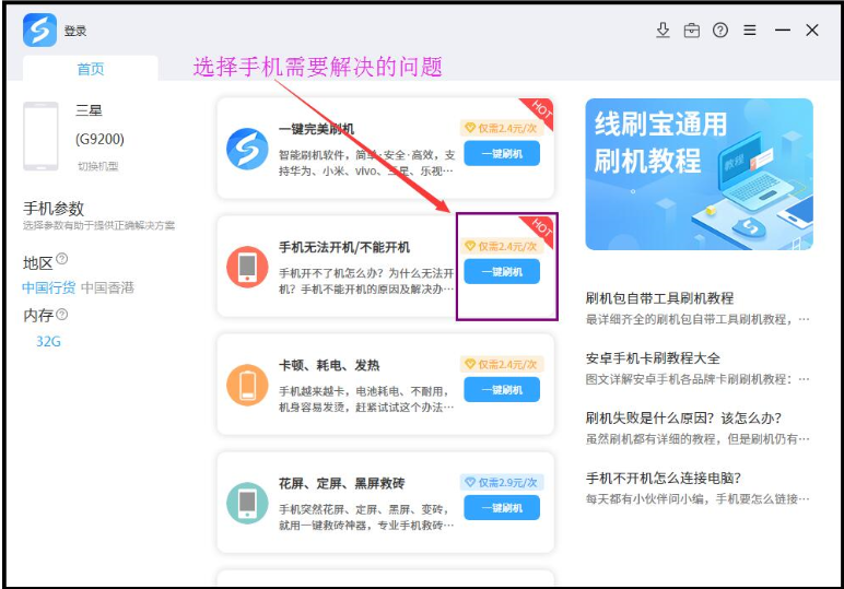 2、然后選擇您手機需要解決的問題,再點“一鍵刷機”