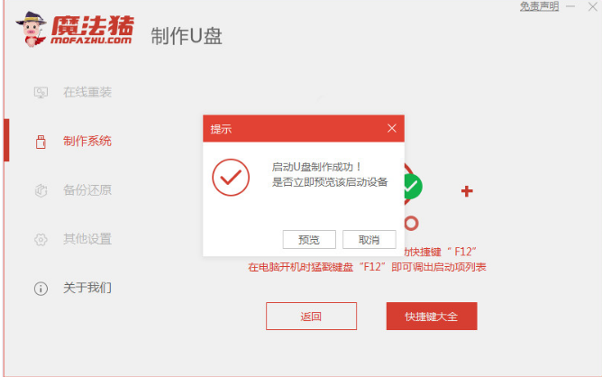 3、請大家耐心等待U盤制作成功后,可以先預覽啟動快捷鍵,返回界面重啟電腦。
