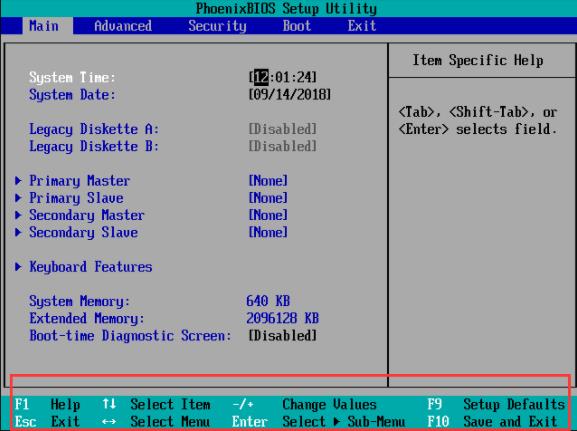 1、進入BIOS設置后,可看到屏幕下方的按鍵提示,在這只需注意四種按鍵提示:鍵盤上的方向鍵可用作光標的移動、鍵盤上的+/-可實現選項位置的移動、回車鍵表示確認,F10表示保持并退出